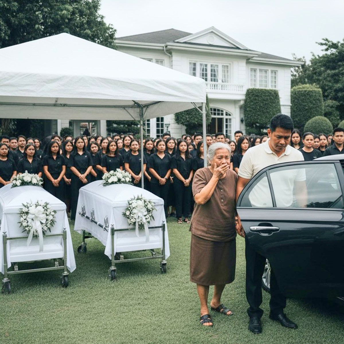 En el centro del patio habían colocado dos ataúdes lado a lado, cubiertos con telas blancas y guirnaldas de caléndulas; el humo del incienso subía en el altar y el triste sonido de una trompeta funeraria resonaba.