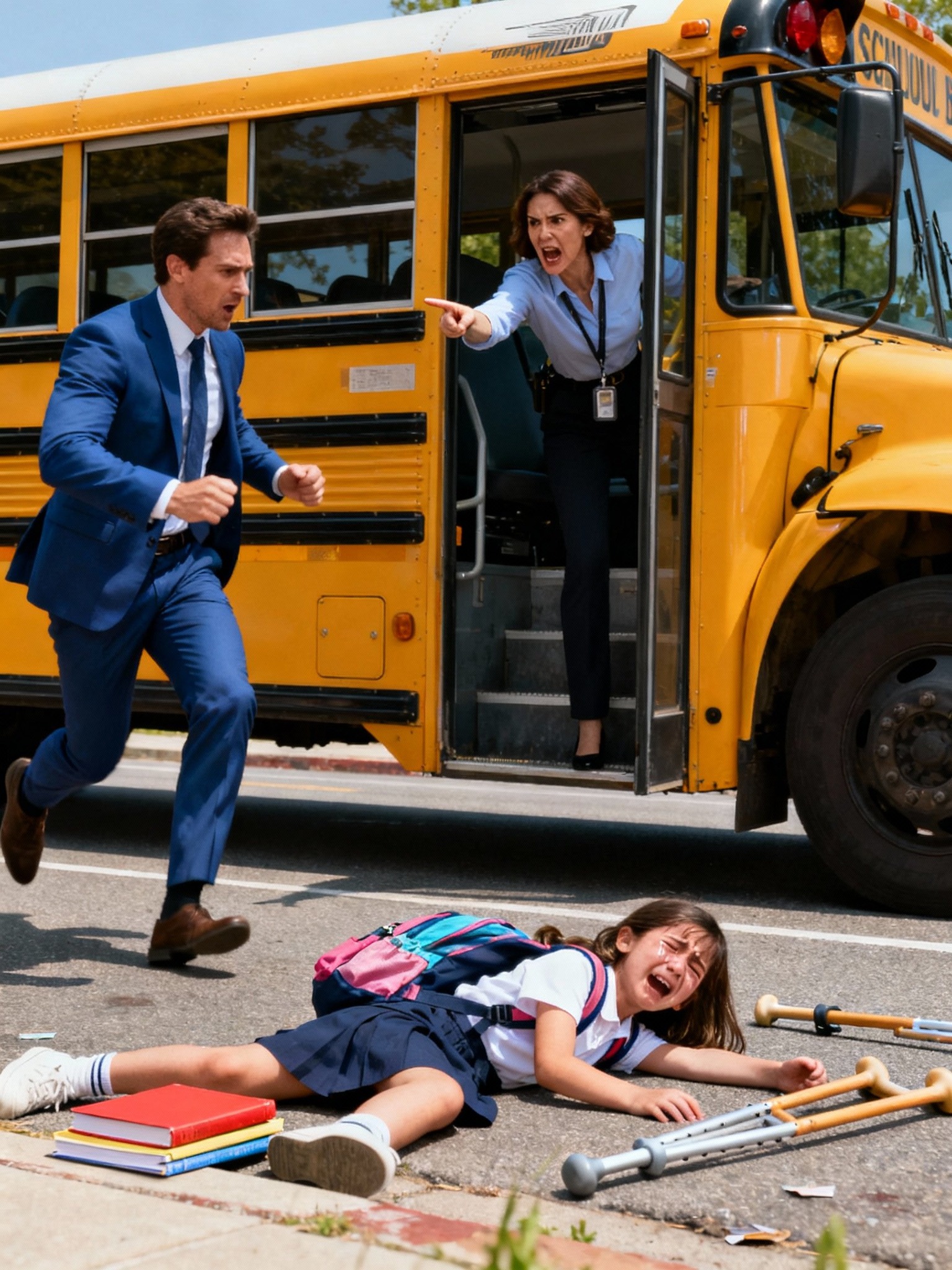 Julián no debía estar allí, pero el presentimiento le quemaba el pecho. Cuando el autobús se detuvo, no vio la habitual sonrisa de Clara. Lo que vio fue a su hija cayendo bruscamente sobre el asfalto, sus libros desparramados y sus muletas rodando lejos de su alcance. Sus gritos de dolor rompieron el silencio de la calle.
